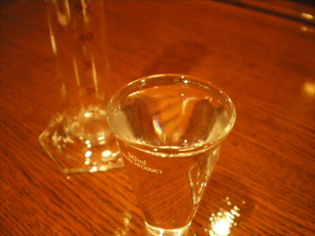 ウチの一杯は30mlです、これは30mlが量れるメジャーカップです、これを用いて注いだそのグラスには30mlの酒が入っています、