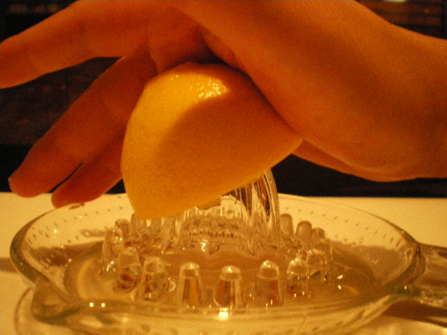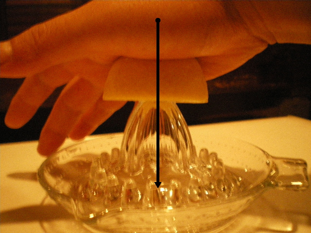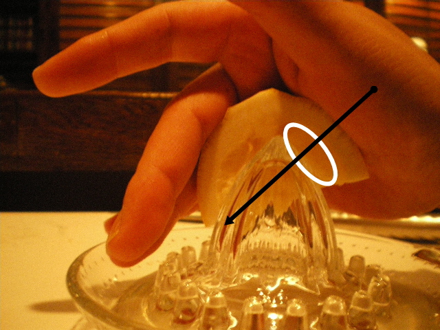 用意ができたらレモンをスクイザーに当て、手の腹、または手の平の中心を使って真上からジワっと押し込みます、(写真1)が、