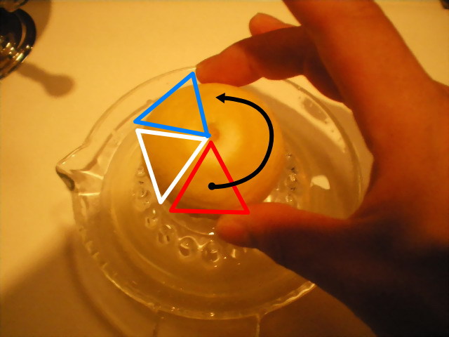 さて、果肉を潰しきり果汁を得たら、またレモンを少し浮かして、左右どちらでも良いのですが回してずらし、カーブを合わせ押し込む。